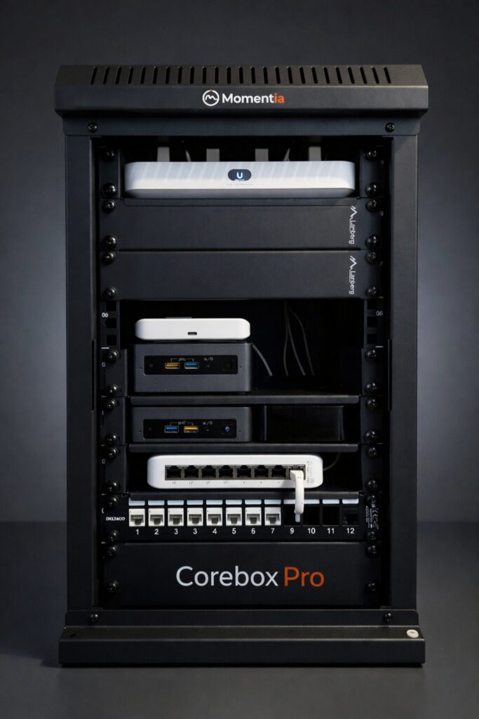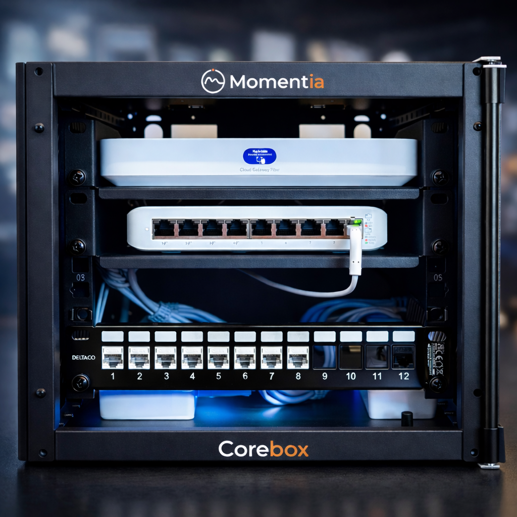 Momentia Corebox er en ferdigbygget og standardisert nettverksplattform levert i kompakt rack – klar til bruk.